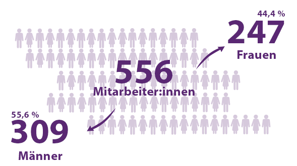 In der EB-Gruppe ist das Verhältnis zwischen Frauen und Männern fast ausgeglichen: Insgesamt gehören zu den 556 Mitarbeiter:innen der EB-Gruppe 309 Männer (55,6 Prozent) und 247 Frauen (44,4 Prozent). Der Anteil der Frauen in Führungspositionen in der EB-Gruppe liegt bei 36,6 Prozent. Wir sind bestrebt, den Anteil weiter zu steigern.